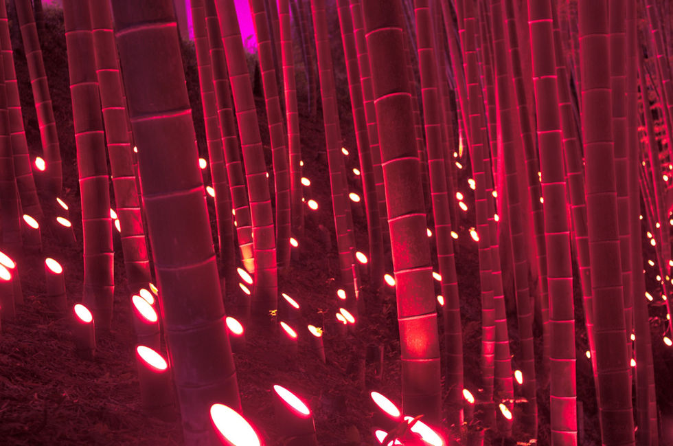 写真は年二回開催している「竹灯籠まつり」、斜面に並べた灯籠が美しく幻想的です。
